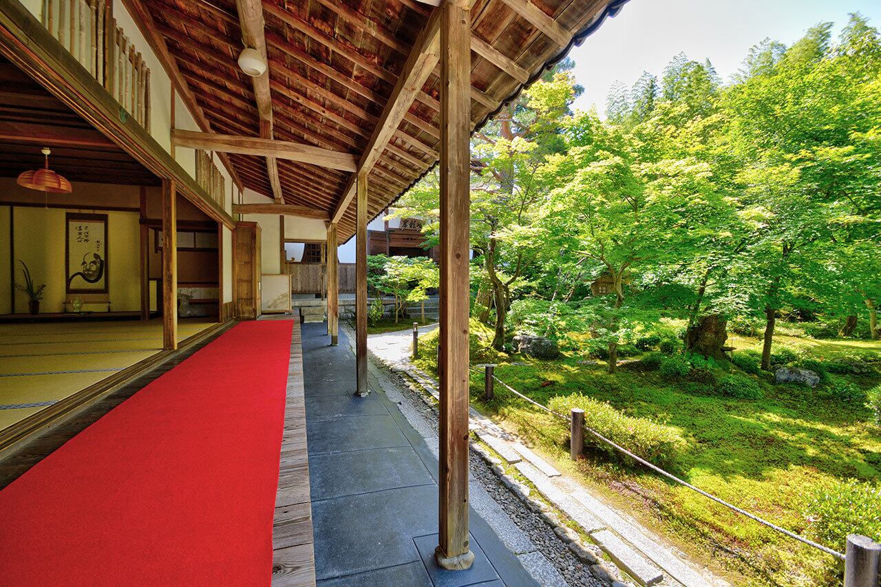 圓光寺の十牛之庭は紅葉で有名ですがこの写真は青紅葉です。室内の達磨大師の掛け軸も写しています。