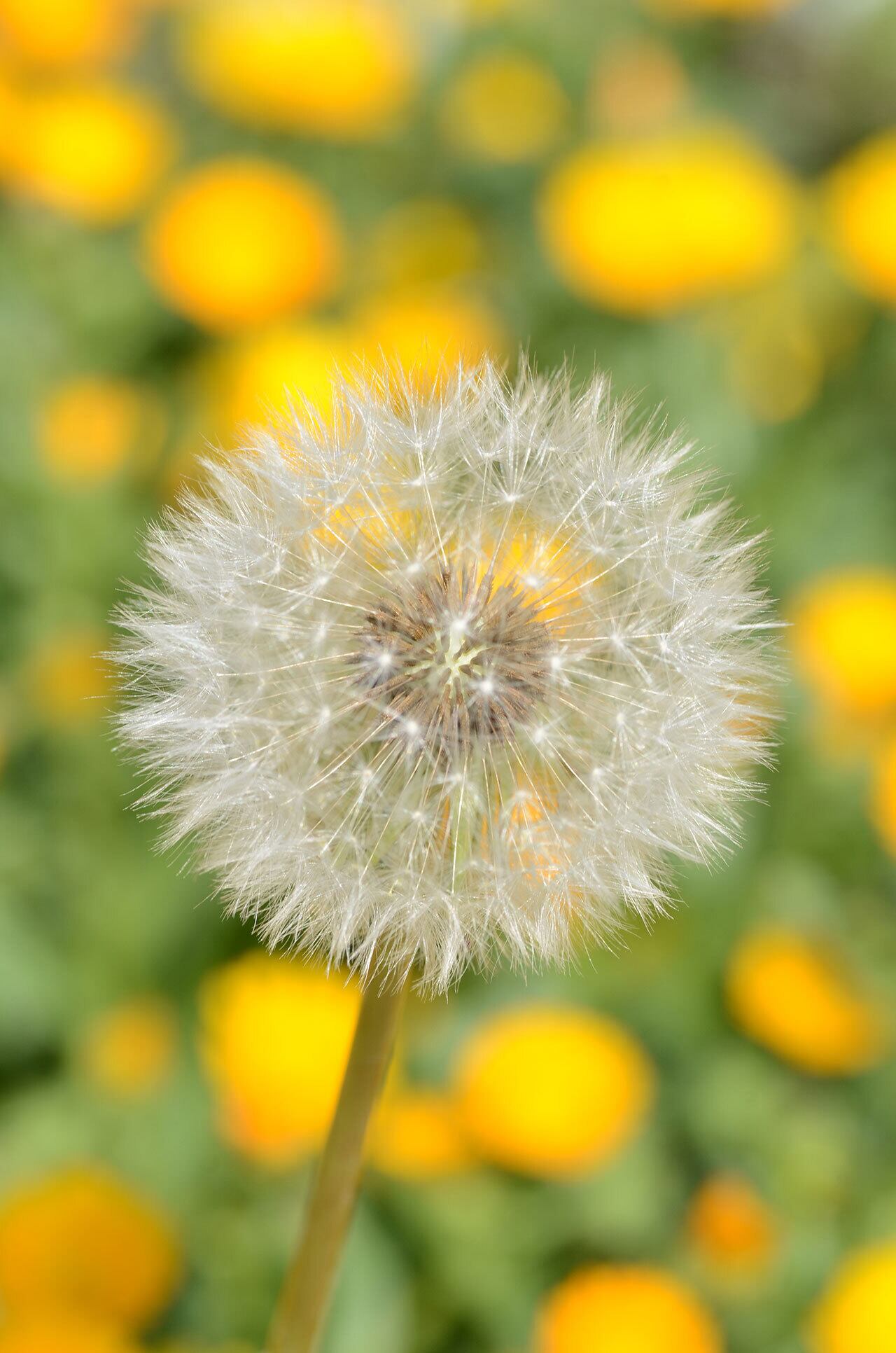 タンポポがたくさん咲いている中で1つだけ綿毛がありました。