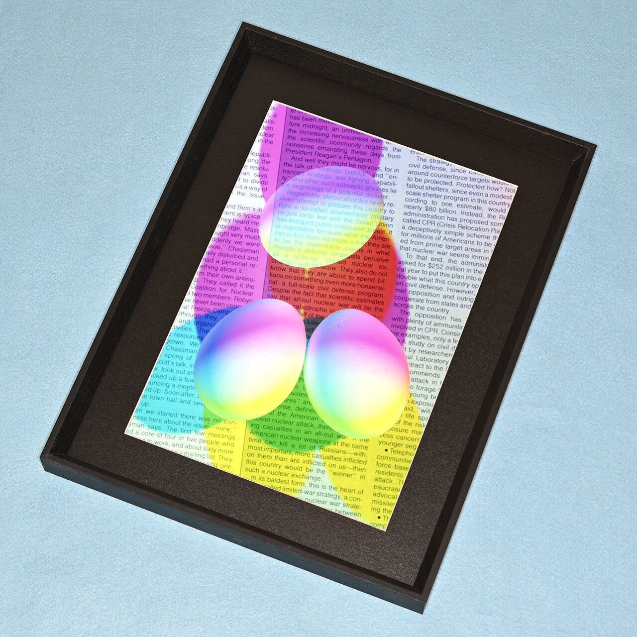 雑誌の上に玉子を置き三色の光でライティングしました。三色重なったところは白色の光になります。