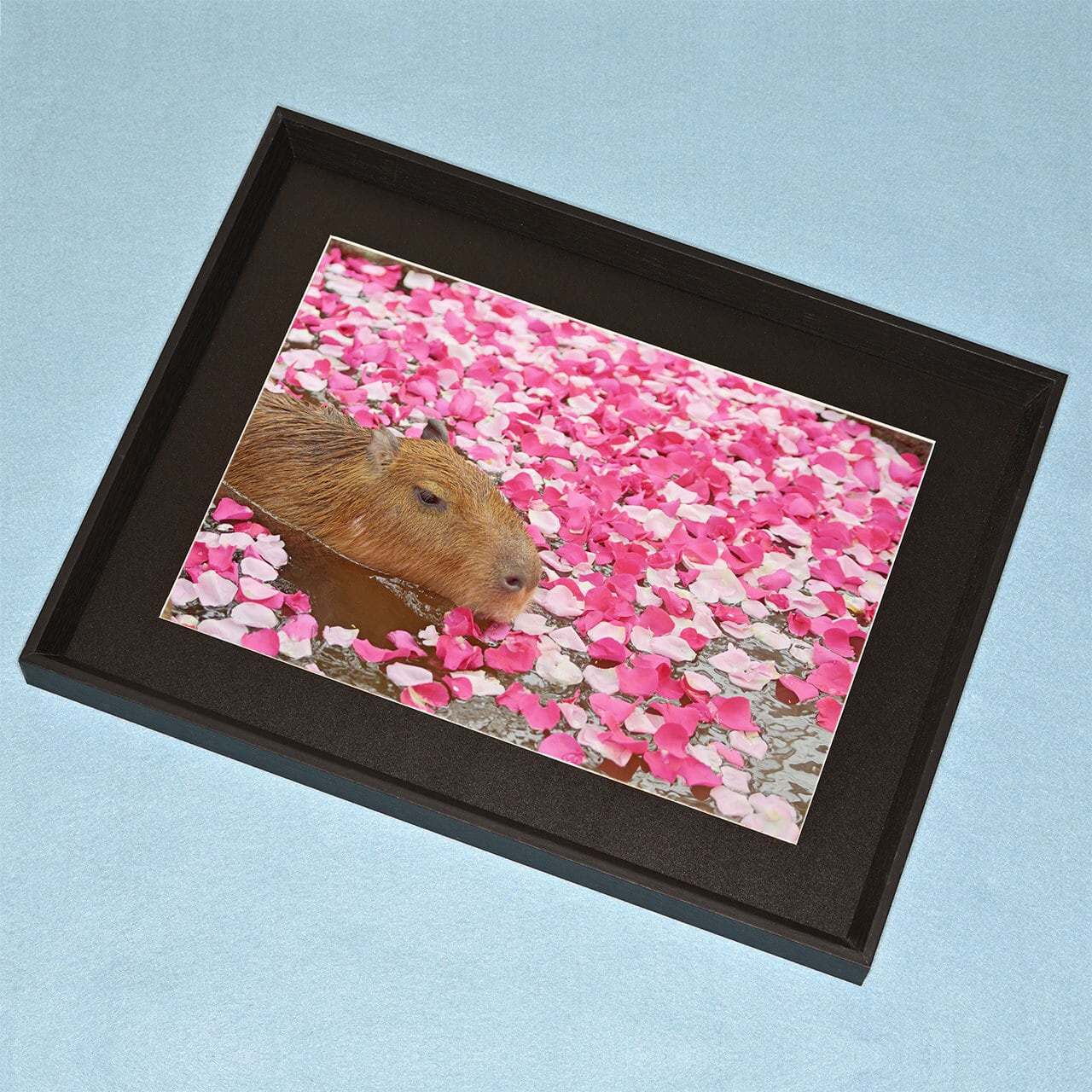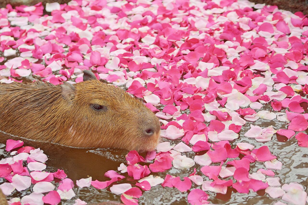 動物王国の薔薇の花びらの風呂に入っているカピバラ