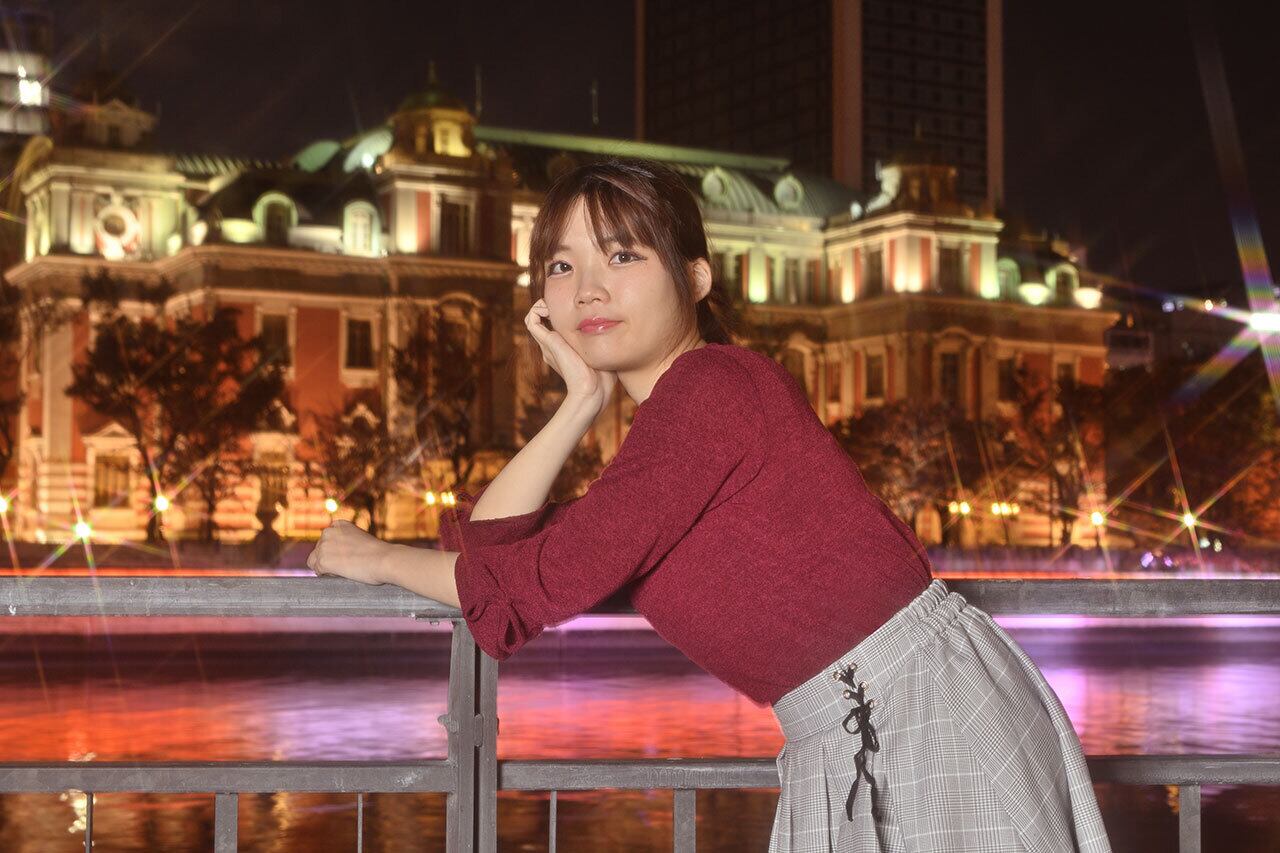 中之島の大阪中央公会堂を背に夜中の何合那音を撮影しました。