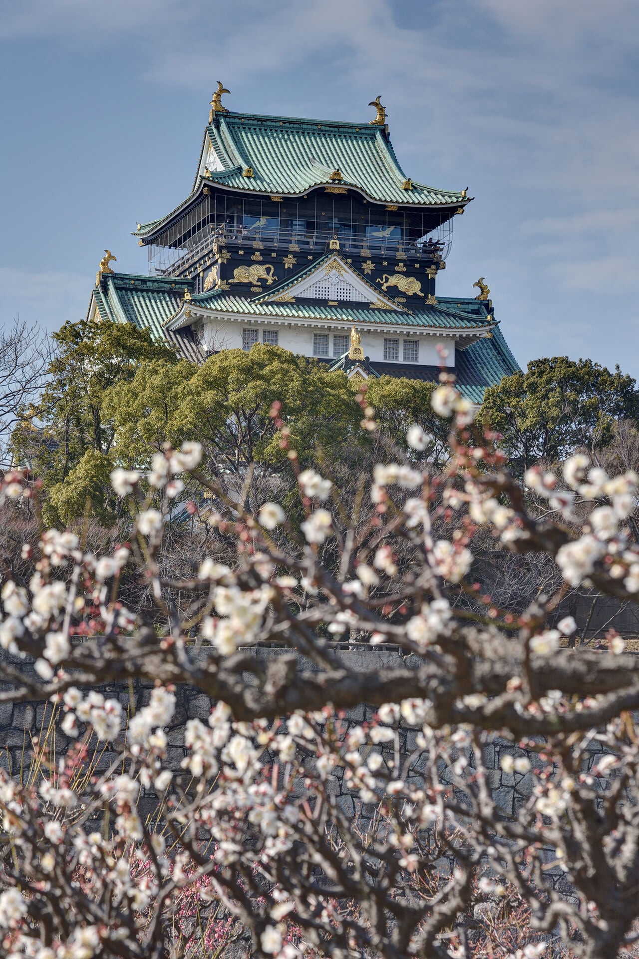 大阪城の天守閣を梅林の白梅と一緒に写しました。